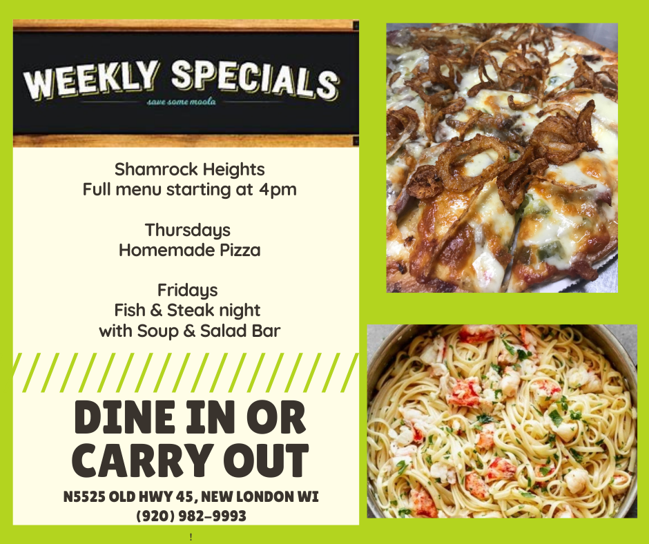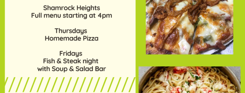 News 1/7 & 1/8 Restaurant Specials Thursday’s Homemade Pizza Full Menu & Special starting at 4pm Happy Hour 5-7pm Special: Jacked Up Prime Rib Pizza Friday Steak & Fish Fry Full Menu & Special starting at 4pm Special: Lobster Scampi over angel hair pasta January 6, 2021/by Carrie Kluge https://www.shamrockheightsgolf.com/wp-content/uploads/2021/01/Dine-in-or-carry-out-3-2.png 788 940 Carrie Kluge https://www.shamrockheightsgolf.com/wp-content/uploads/2019/04/logo2-300x133.png Carrie Kluge2021-01-06 11:31:352021-01-06 11:34:411/7 & 1/8 Restaurant Specials