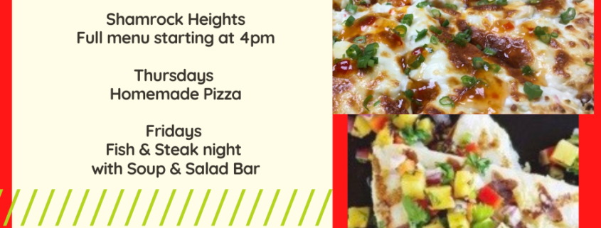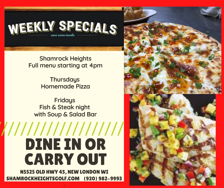 News Restaurant Specials 3/11 & 3/12, St Pat’s & Easter! Thursday’s Homemade Pizza Full Menu & Special starting at 4pm Happy Hour 5-7pm Specials: Pizza – Crab Rangoon Friday Steak & Fish Fry Full Menu & Special starting at 4pm Specials: BBQ Ribs Grilled Mahi Mahi with Pineapple Salsa Looking Ahead… Pizza Specials Schedule 3/18 Plated Corned Beef & Cabbage 3/25 Shrimp Scampi Pizza 4/1 Jacked Up Prime Rib Pizza 4/8 Bacon Explosion Pizza March 10, 2021/by Carrie Kluge https://www.shamrockheightsgolf.com/wp-content/uploads/2021/03/Dine-in-or-carry-out-15.png 788 940 Carrie Kluge https://www.shamrockheightsgolf.com/wp-content/uploads/2019/04/logo2-300x133.png Carrie Kluge2021-03-10 20:35:312021-03-10 20:44:40Restaurant Specials 3/11 & 3/12, St Pat's & Easter!